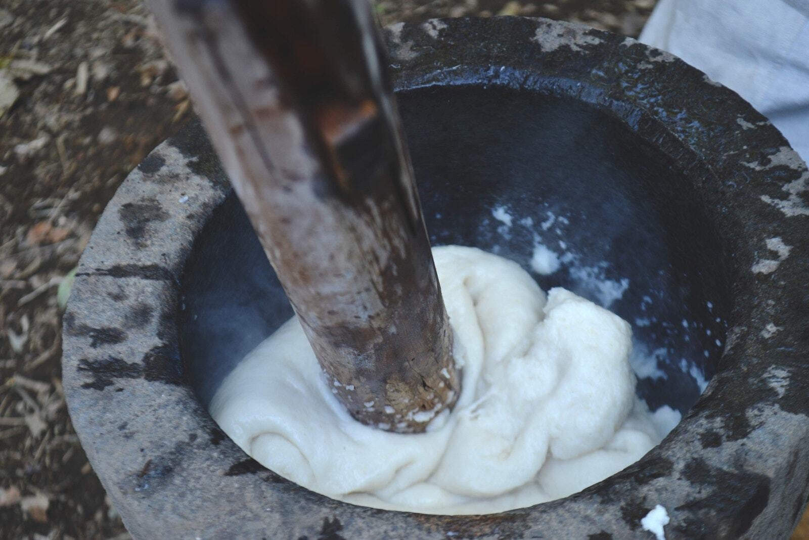 無農薬・無化学肥料でつくった白米を蒸して、丁寧につぶし、つきました。